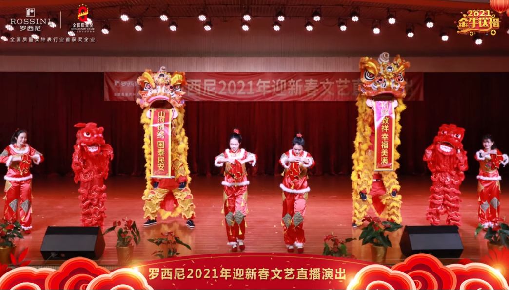 2021年是我國(guó)“十四五”的開局之年,羅西尼藝術(shù)團(tuán)精彩的表演更是表達(dá)了羅西尼在新形勢(shì)下攜手并進(jìn)的決心。迎新春文藝直播演出在節(jié)目《報(bào)春》中正式拉開帷幕,醒獅步步喜樂開顏,歡樂音樂震耳欲聾、吉慶開懷。