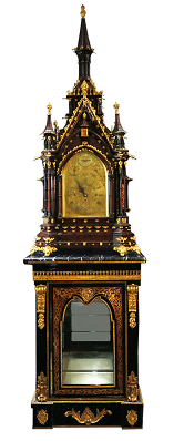 英國A&Rowley公司製造。整體風(fēng)格按照德國科隆大教堂設(shè)計,鐘身嵌銅花,原裝銅質(zhì)底座,現(xiàn)配大理石底座。