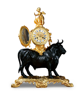 19世紀(jì)初由法國製造。銅鍍金瓷片貼錶盤、鍍金指針、羅馬數(shù)字時標(biāo)。